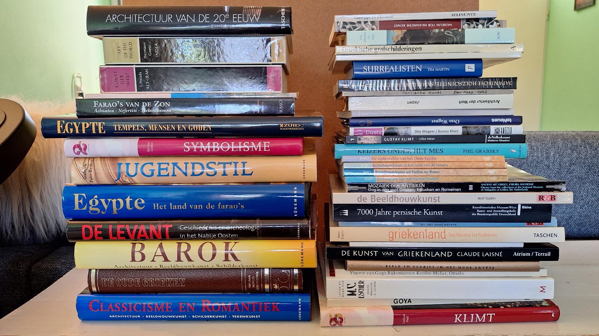 | Uitgebreide omschrijving: | Mooie boeken in een uitstekende staat met de volgende titels: Islam- Kunst en architectuur Könemann Schittering van de tsaren Ludion Museum Catharijneconvent Alphonse Mucha Atrium Monriaan logboek Atrium Malevich Könemann Malevich Cameo/Abrams Monriaan Sirrocco Die geschichte der Spanischen kunst Könemann Vroege middeleeuwen Taschen Het verhaal van de gothiek in Leuven Brabantse bouwmeesters Gem Leuven Grote meesters van de westerse schilderkunst Schilderessen Zuid boekprodukties De kunst uit de italiaanse Renaissance Könemann Iconen in de abdij Museum voor religieuze kunst Uden 2002 Hundertwasser portfolio Taschen Klimt 12 large reproductions Gallery Series Hindoeïstisch India Taschen Kandinsky Taschen De Renaissance Parool/Life Baukunst des Ostens Burkhard Verlag Romaanse kunst Könemann Nederlandse schilderkunst tussen detail en grandeur Atrium Het oude China, de Chinese beschaving van de oorsprong tot de Tang-dynastie Zuid Boekprodukties Schatten van de tsaar Museum Boymans van Beuningen Rotterdam Gothiek, Architectuur, Beeldhouwkunst, Schilderkunst Könemann Antoni Gaudí Taschen Authentiek Afrika Könemann Maya de goddelijke koningen van het regenwoud Könemann De levant Geschiedenis en archeologie in het nabije Oosten Könemann Barok Architectuur, Beeldhouwkunst, Schilderkunst Könemann De oude Grieken Lecturama Classicisme en Romantiek Architectuur, Beeldhouwkunst, Schilderkunst Könemann Jugendstil Könemann Symbolisme Taschen Egypte Tempels, mensen en goden Zuid boekprodukties Egypte Het land van de farao's Könemann Farao's van de zon Achnaton, Nefertiti, Toetanchamon Rijksmuseum van oudheden Ludion Klimt Taschen Goya de groten van alle tijden De geïllustreerde pers n.v. Amsterdam M.C.Escher Meulenhof Amsterdam Vincent van Gogh Rijksmuseum Kröller-Müller, Otterlo Atelier van het zuiden Van Gogh, Gauguin Van Gogh museum Kunst der Welt Alt-Iran Holle Art of the world India Methuen Museum für Islamische Kunst Verlag Philipp von Zabern Selinunte Die faszination der Griechischen und Kathargischen zivilation Beeld en schrift in het oude Egypte Schuyt&Co Standaard 7000 Jaar perzische kunst Haags Gemeentemuseum Surrealisten Parragon Japanische Holzschnitte Piazza Armenia Die romanische kultur im spiegelbield der mosaiken van casale Japan Architektur der Welt Office du livre Pot en penseel gids voor de verzameling Grieks aardewerk in het Rijksmuseum van oudheden te Leiden Archeologie van het nabije Oosten Rijksmuseum van Oudheden* Beeldhouwkunst uit Hellas en Rome Rijksmuseum van Oudheden Beeldhouwkunst in het land van farao's Rijksmuseum van Oudheden* De dodencultus van het ude Egypte Rijksmuseum van Oudheden* De kunst van Griekenland Architectuur, Beeldhouwkunst, Schilderkunst Atrium/Terrail Griekenland Van Mycene tot Parthenon Taschen Dal der Koningen Gids over graven en tempels uit het oude Egypte R&B Keizers onder het mes Opkomst en ondergang van het romeinse Rijk Teleac not Klimt Taschen Duets Otto Wagner and Gustav Klimt Hdi Harper design international Otto Wagner teNeues 7000 Jahre persische Kunst Meisterwerke aus dem Iranischen Nationalmuseum in Teheran Skiira De beeldhouwkunst Geschiedenis en ontwikkeling van de beeldhouwkunst in Europa van prehistorie tot de 21ste eeuw R&B Mozaiek der Antieken Oog in oog met Grieken, Etrusken en Romeinen Rijksmuseum van Oudheden Leiden Scenes uit het oude Hellas Koninklijke musea voor kunst en geschiedenis Etruskische grafschilderingen Atrium cultuurgidsen Van Achilleus tot Zeus Thema's uit de klassieke mythologie Sun Architectuur van de 20e eeuw Taschen Geschiedenis van de architectuur in de 20e eeuw Könemann Geschiedenis van de architectuur van de oudheid tot heden Könemann Der Alte Orient Komet Kurzführer Pergamonmuseum Antikensammlung Vorderasiatisches Museum Staatliche Museen zu Berlin Pieter Bruegel Meesters van de lage landen Könemann Nederlandse bouwkunst Een geschiedenis van 10 eeuwen architectuur Atrium Huizen in steden Ontwikkeling en vernieuwing in 800 jaar stedelijke woningbouw Atrium De Amsterdamse School Atrium Jan Steen Schilder en verteller Waanders uitgevers World architecture An illustrated history Hamilyn Wenen Kunst en architectuur Könemann Charley Toorop Brusse n.v. Rotterdam Chinesische Kunst Knaur The ancient sun Kingdoms of the Americas Panther Wonen in de wolken Sky-high living Magazine de slanke stad Boedhistische kunst ter ere van het goddelijke Atrium Japanese art Spring Books London Aztec life Ticktock Kennismaking met Middeleeuwse kunst Camebridge kunstreeks Kosmos Z&K Altamerikanische Skulptur Weltsprache der Form Duisburg Kunstschatten uit het oude Mexico De nieuwe Kerk Amsterdam Gold und Silber aus dem alten Amerika Landesmuseums Koblenz El Dorado Goudkoorts in Zuid-Amerika Time-life Architectuur in Nederland Jaarboek 88-89 Van Loghum-Slaterus Deventer Renoir Zetwerk Intertext, Antwerpen Ilja Repin Het geheim van Rusland Waanders uitgeverij Picasso Taschen Rembrandt De groten van alle tijden De geïllustreerde Pers N.V. Amsterdam Bouwstijlen in Nederland 1040 – 1940 Sun Het nieuwe ornament De eeuw van de beeldenstorm Staatsuitgeverij “s Gravenhage Jan Tinholt Smelik Stokking Galleries Repetitorium voor de geschiedenis der bouwkunst Delta Press B.V. Amerongen H. de Toulouse-Lautrec Zijn leven - Zijn werk R&B Leonardo Da Vinci De groten van alle tijden De geïllustreerde Pers N.V. Amsterdam Chagall Sirrocco Domela Éditions Carmen Martinez Die Bilderwelt des Pieter Bruegel Abi Melzer's Productions Jheronimus Bosch Kunst & Antiek journaal Russische Impressionisten Gallerie Renoir Moderne kunst Rebo Productions De Haagse School, De Stijl en Monriaan Rebo Productions Impressionisten R&B A guide to Art Nouveau Style JG Press Den Haag Over bouwen, breken en behouden Paagman Architectuur in Nederland Taschen De Architectuurgids Geïllustreerd overzicht van stijlperioden, bouwelementen en materialen Librero Voor de eeuwigheid gebouwd Geniale vormen, bouwwerken en object