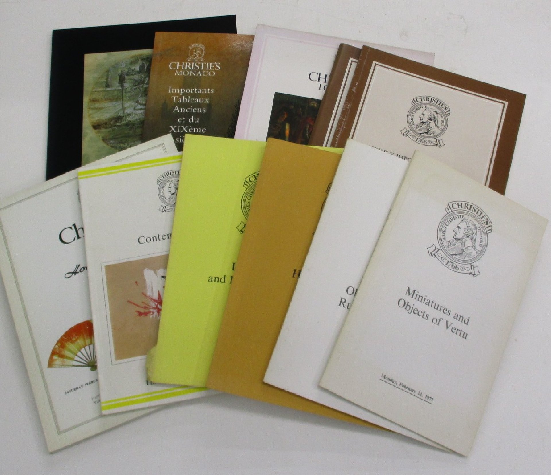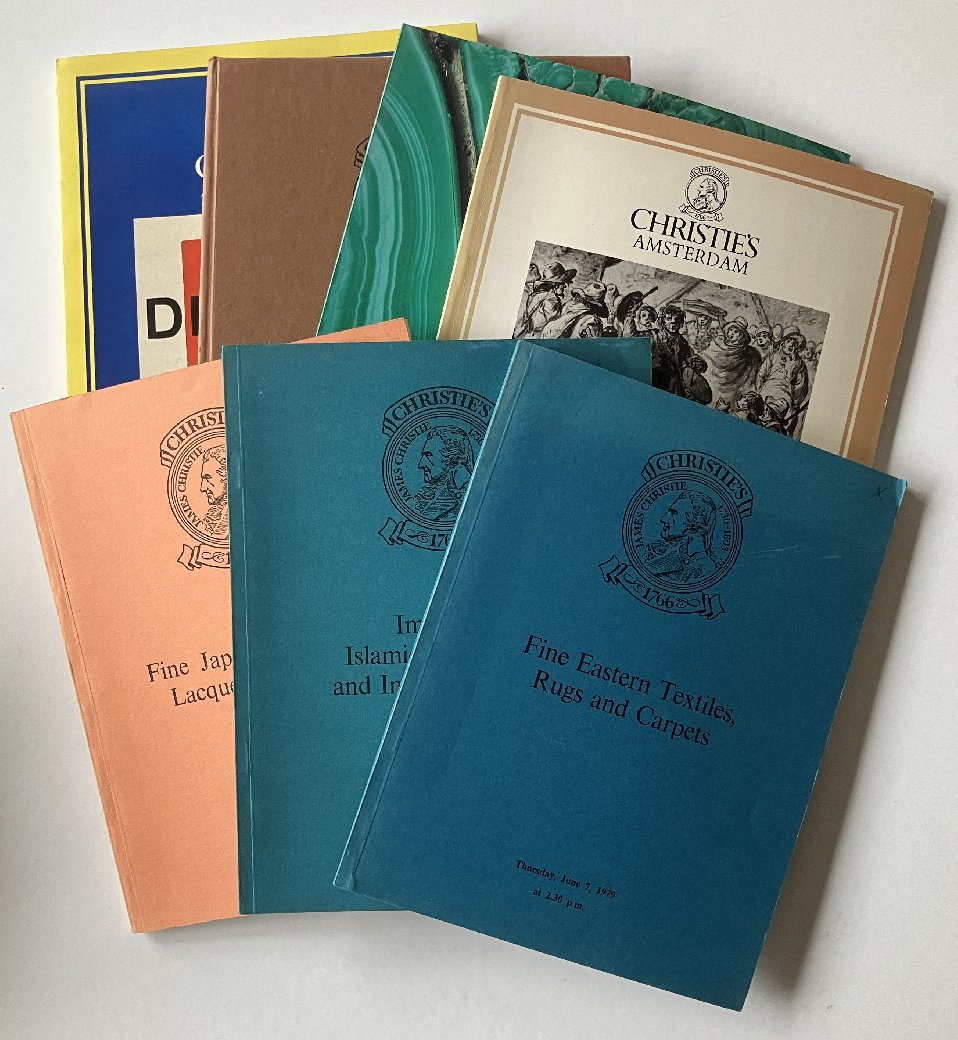 | Uitgebreide omschrijving: | Miniatures, Jewellery, Ivory Patch-Boxes, Enamel and Silver Snuff-Boxes, Russian and other Works of Art 1977 - 16 pagina's afbeeldingen Fine Miniatures Objects of Vertu and Russian Works of Art 1977 - 24 pagina's afbeeldingen Highly Important English Pictures 1978 - 146 besproken kavels met afbeeldingen Impressionist and Modern Paintings 1979 - 71 beschreven kavels met afbeelding Contemporary Art 1979 - 62 afbeeldingen Christie's at the Hotel Okura Tokyo - part II Tokyo - 1980 - 390 afbeeldingen Highly Important Bronzes, Wood-Carvings and other Works of Art 1980 - 156 beschreven kavels met afbeeldingen Antiquities, Works of Art and 19th Century Sculpture 1981 - geniet boekje - 360 beschreven kavels met afbeeldingen Important 19th Century Pictures 1984 - 75 afbeeldingen Importants Tableaux Anciens et du XIXème Siècle Monaco - 1987 - 100 kleurenafbeeldingen Dutch, Flemish and German Drawings Amsterdam - 1989 - 226 beschreven kavels met afbeeldingen Fine Eastern Textiles, Rugs and Carpets – 36 pagina’s - June 7, 1979 met ± 50 afbeeldingen waarvan enkele in kleur. Important Islamic Manuscripts and Indian Manuscripts – 43 pagina’s tekst en 28 pagina’s afbeeldingen - november 9, 1977 Fine Japanese Ceramics, Lacquer and Bronzes - 53 pagina's tekst en 63 pagina’s afbeeldingen - April 19, 1977 Dutch, Flemish and German Drawings - 95 pagina's - 30 november 1987 Russian Sale on Saturday - Silver, Icons, Ceramics, Jewellery, Pictures and Works of Art 58 pagina’s 4 september 1983 The Robert Strauss Collection of Renaissance and Other Bronzes – 141 pagina’s – May 3, 1977 Fine Modern and Temporary Art, including "De Stijl" – 128 pagina’s – 21 May 1987 18 veilingcatalogi Christie's met een aantal Estimate List (richtprijzen) - alle veilingen London, tenzij anders vermeld. conditie : goed (op één beschadigde rug en één exemplaar met twee losse pagina's na) gewicht totaal : ± 7 kg. |