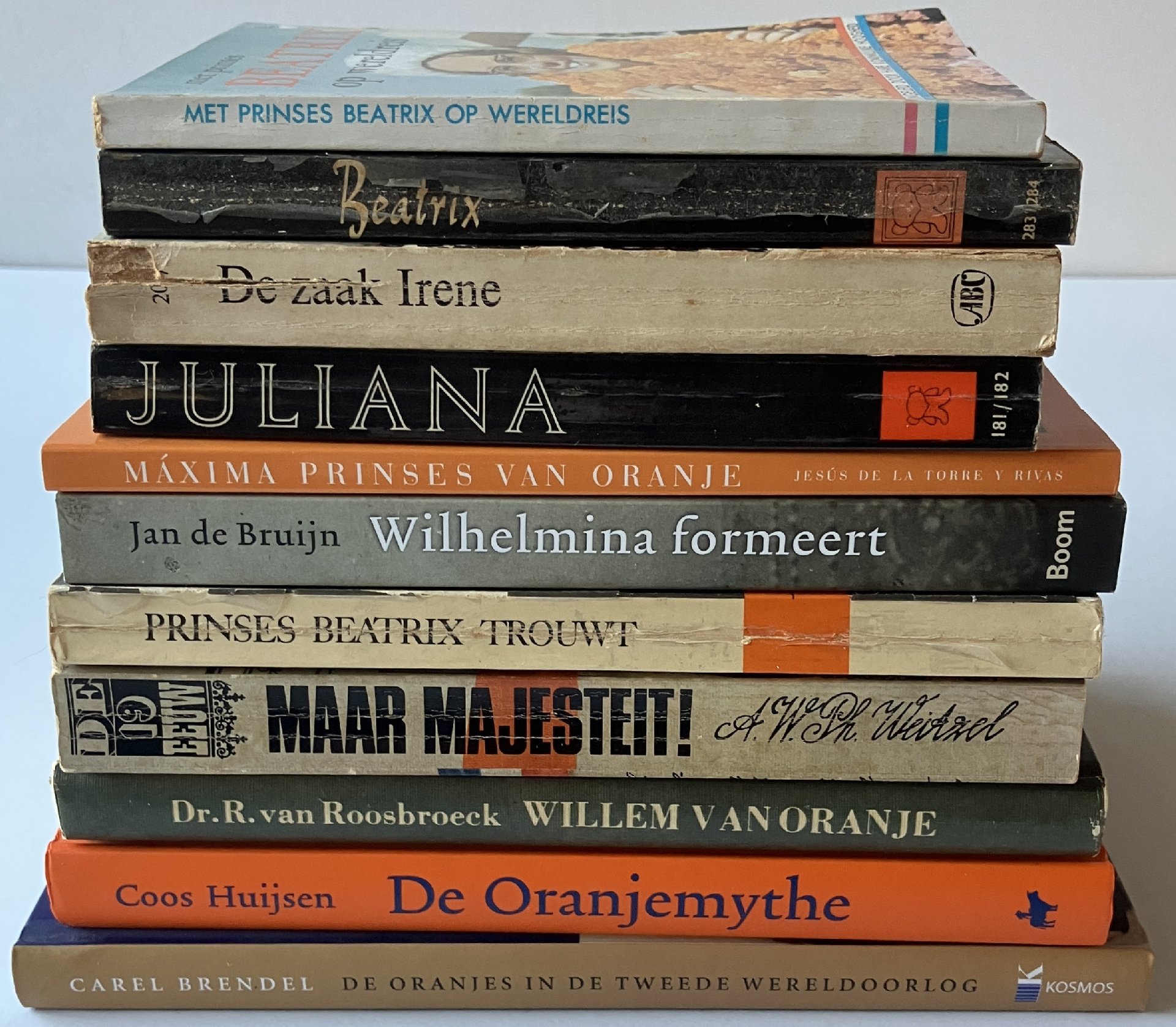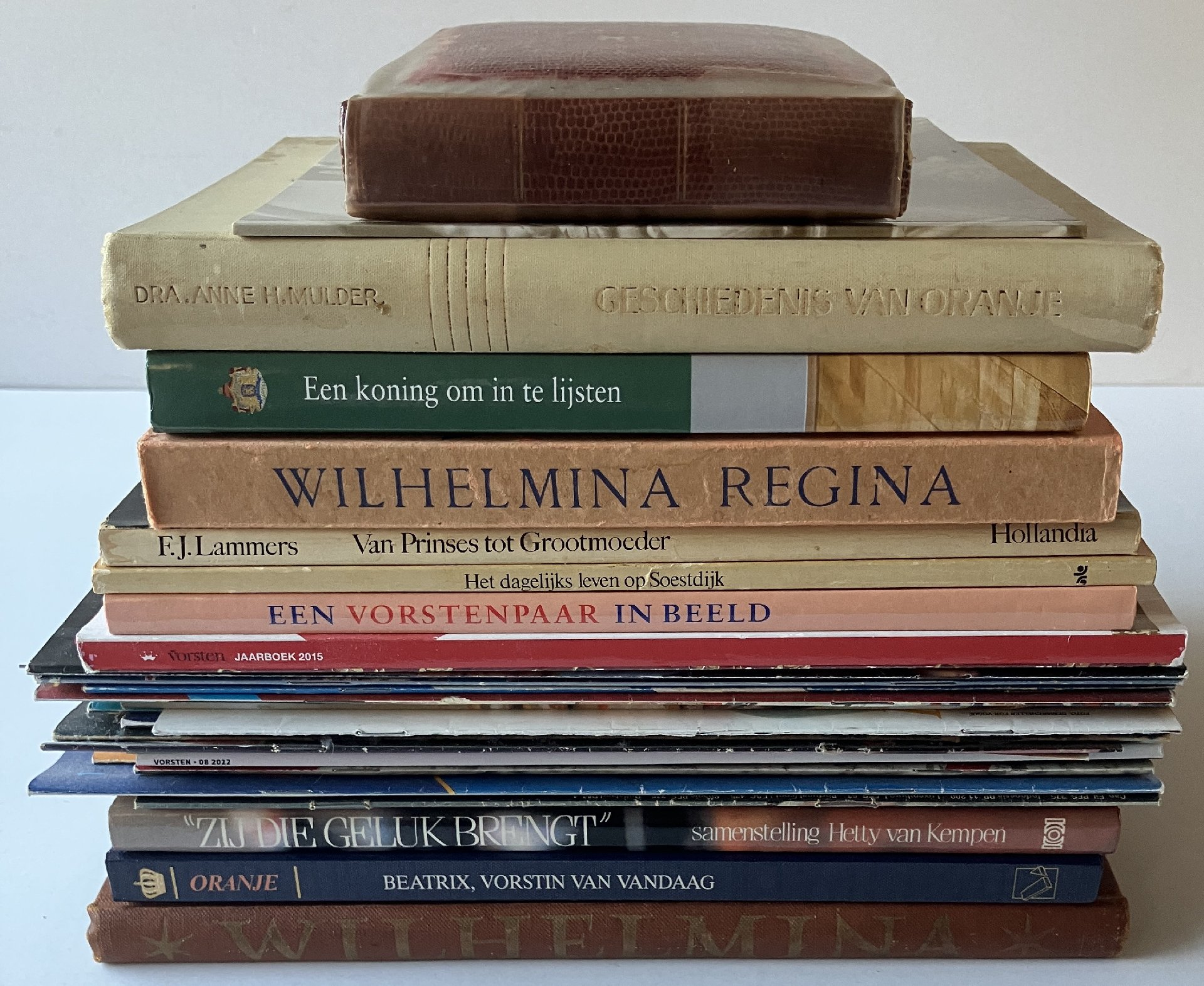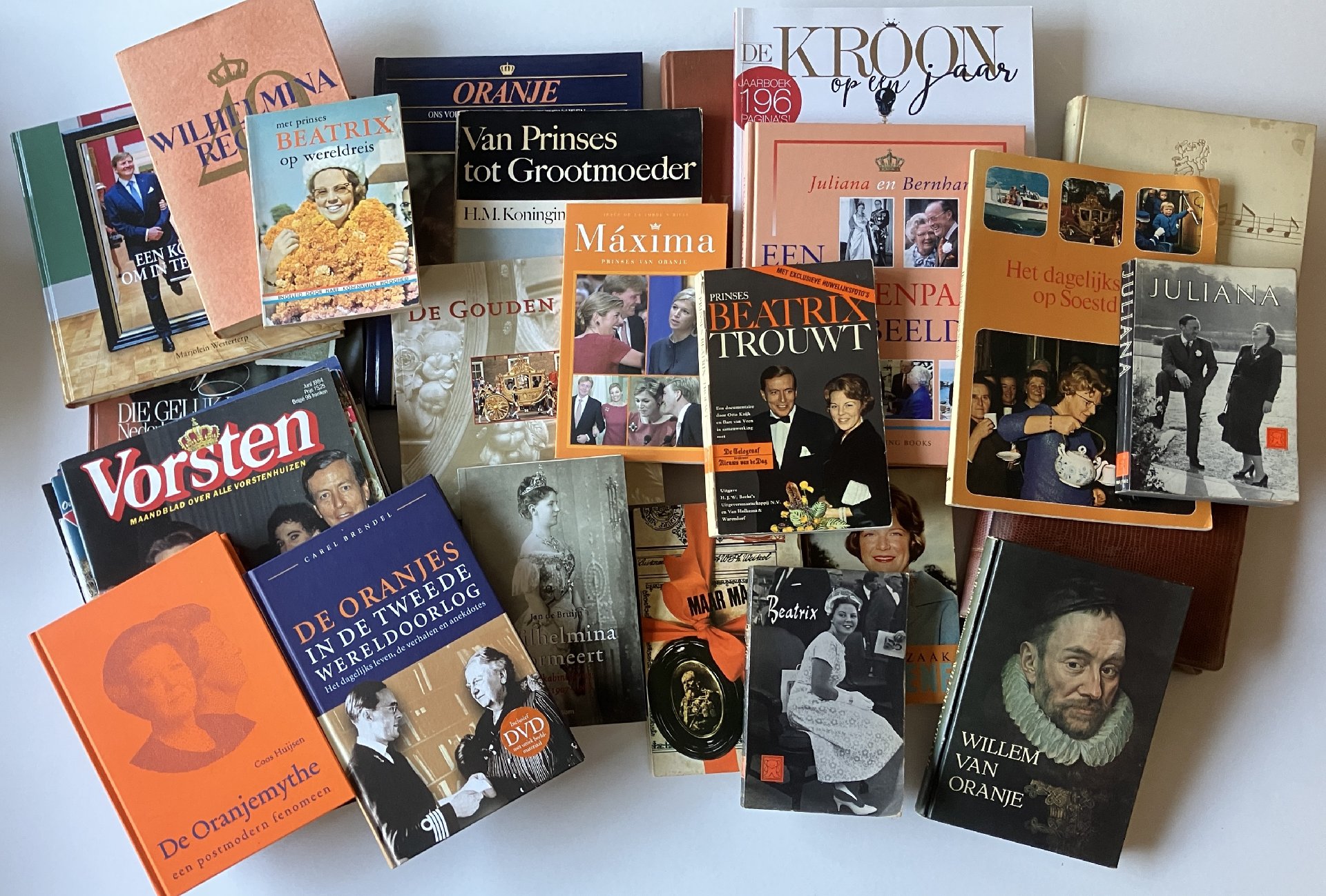 | Uitgebreide omschrijving: | De Oranjes in de Tweede Wereldoorlog – Carel Brendel Willem van Oranje – Dr. R. van Roosbroeck Fotoalbum Koninklijke Familie Maar Majesteit – A.W.P. Weitzel Wilhelmina formeert – Jan de Bruijn De kroon op een jaar (2015) Een vorstenpaar in beeld 23 Tijdschriften Geschiedenis van Oranje – A. Mulder Het dagelijks leven op Soestdijk De Oranjemythe – Coos Huijsen voor Koning en Vaderland – Aad Jongbloed Beatrix – Dra. M.G. Schenk De zaak Irene Prinses Beatrix trouwt Juliana Maxima Met Prinses Beatrix op reis Een koning om in te lijsten – M. Westendorp Wilhelmina Regina De gouden koets Van Prinses tot Grootmoeder – Juliana 60 jaar Ons vorstenhuis door de eeuwen heen Zij die geluk brengt – Hetty van Kempen Totaal ± 16 Kg. |