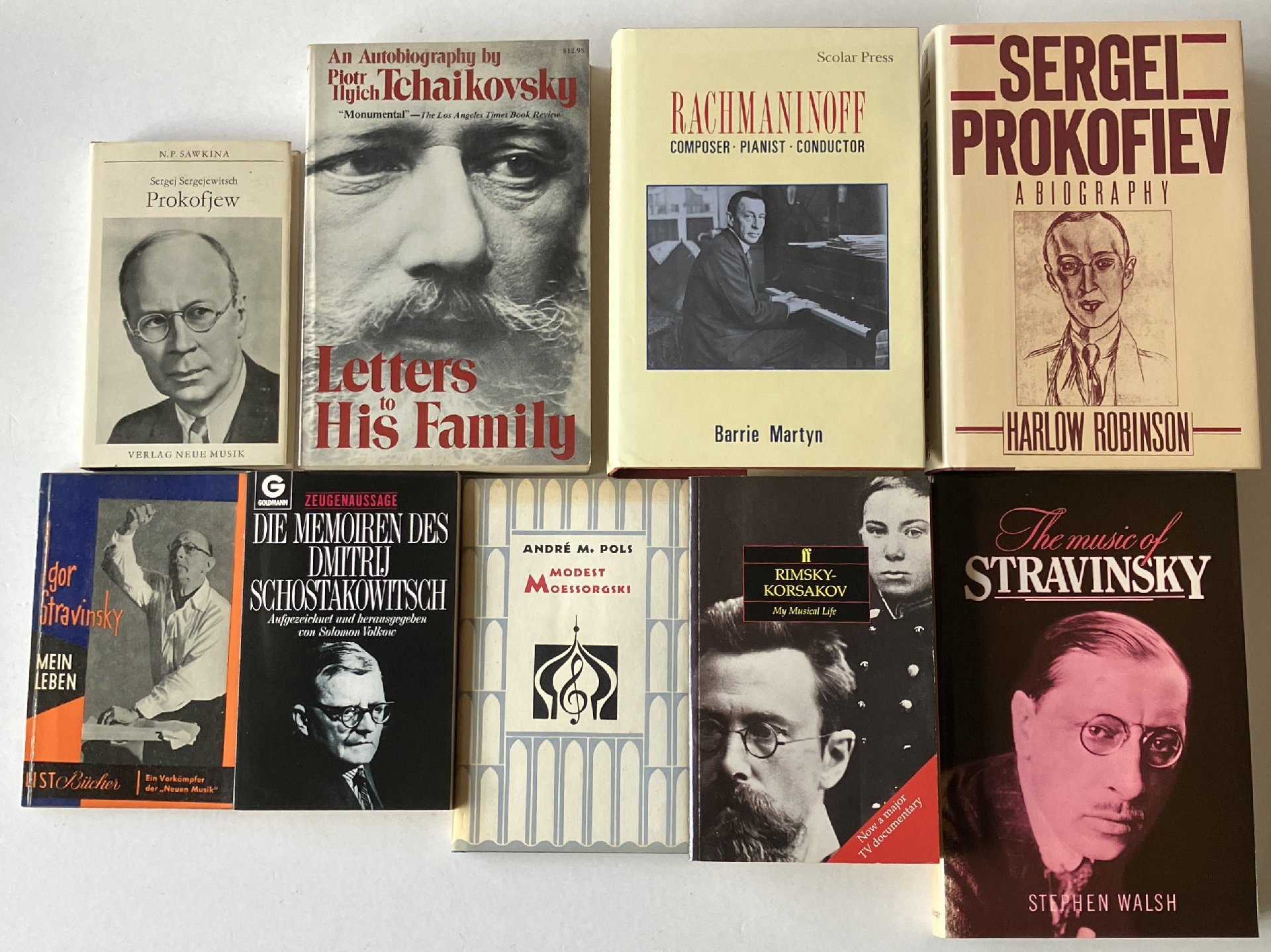 | Uitgebreide omschrijving: | Rachmaninoff – Barrie Martyn – Scolar Press, 1990 – 584 pp. (engels) Sergei Prokofiev – Harlow Robinson – Viking, 1987 – 573 pp. (engels) Letters to His Family – Tchaikovsky – Stein and Day, 1982 – 577 pp. (engels) My Musical Life – Rimsky Korsakov – Faber and Faber, 1989 – 478 pp. (engels) The music of Stravinsky – Stephen Walsh – Rotledge, 1988 – 317 pp. (engels) Modest Moessorgski – André M. Pols – Wereld bibliotheek, 1957 – 125 pp. (nederlands) Die Memoiren des Schostakowitsch – van Solomon Volkow – Goldmann, 1989 – 319 pp. (duits) Mein Leben – Igor Stravinsky – Paul List, 1958 – 170 pp. (duits) Prokofjew – N.P. Sawkina – Neue Musik, 1984 – 211 pp. (duits) Vraagprijs 65 euro of doe een redelijk bod. |